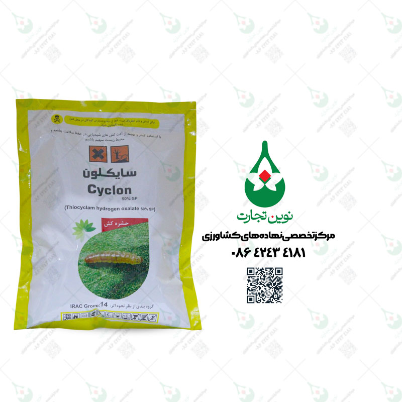سایکلون حشره کشی است با ماده موثره تیوسیکلام – هیدروژن اکسالات با اثر تماسی و گوارشی و خاصیت محدود سیستمیک. سایکلون از گروه آنالوگ سموم عصبی با منشاء بیولوژیکی است که از نوعی کرم دریایی استخراج میشود. این سم روی گیرنده های نیکوتینیک سیستم اعصاب اثر میکند ولی نحوه اثر آن منحصر به فرد است و مقاومت مشترکی با سموم نئونیک ندارد ، از این رو حشراتی را که به سموم دیگر مقاوم شده باشند بخوبی کنترل مینماید و ابزار مناسبی برای شکستن مقاومت به سمومی مانند ایمیداکلوپراید و استامی پراید محسوب میشود. سایکلون اثر سیستمیک و ترانسلامینار (نفوذ در سلولهای برگ) دارد و میتواند حشراتی را که داخل برگ نفوذ کرده اند مانند ساقه خوار ها ، مینوز یا تریپس را به آسانی کنترل نماید. تیوسیکلام در محیط به سرعت تجزیه میشود و از این رو برای حشرات مفید نیز کم خطر محسوب میشود و میتوان از آن در سیستم های مدیریت تلفیقی آفات سود جست. فرمولاسیون سایکلون به صورت پودر قابل حل در آب است و از این رو به آسانی در آب حل شده و هیچگونه ذرات معلق یا نامحلول به همراه ندارد و موجب گرفتگی نازلها یا ته نشین شدن در تانک سمپاش نخواهد شد. مقدار مصرف سایکلون یک کیلوگرم در هکتار برای مزارع و یک در هزار  برای گلخانه ها توصیه میشود. احتمال دارد برخی از ارقام گوجه فرنگی حساسیت موردی نسبت به این سم نشان دهند لذا اگر سابقه مصرف ندارد پیشنهاد میشود ابتدا سم روی چند بوته آزمایش شود.