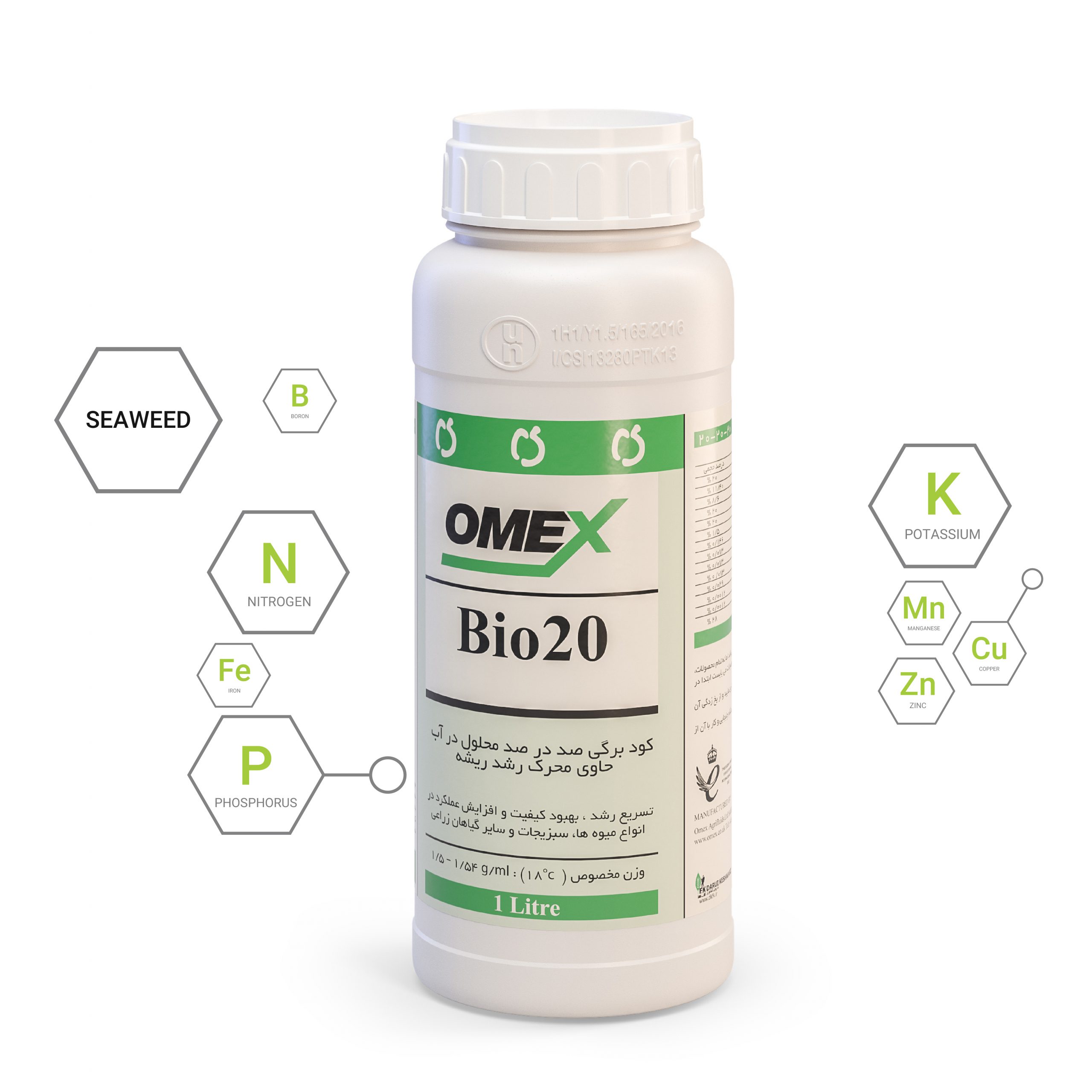 کود بیو ۲۰ امکس یک امولسیون بسیار غلیظ حاوی عناصر ماکرو و میکرو کلات شده و عصاره جلبک دریایی است. بیو ۲۰ برای افزایش تولید محصولات کشاورزی در شرایط تنش مانند دمای بالا، شرایط خاک، رطوبت و بیماری ها طراحی شده است. این محصول برای تغذیه و تامین عناصر غذایی ضروری گیاهچه ها (نشاء) و گیاهان بزرگ تر تولید شده است. همچنین در بیو ۲۰ از عصاره یک نوع جلبک دریایی که فواید ثابت شده ای در تحریک رشد ریشه دارد استفاده شده است. کاربرد بیو ۲۰ باعث افزایش بایومس ریشه و در نتیجه افزایش راندمان مصرف رطوبت و مواد غذایی می شود.